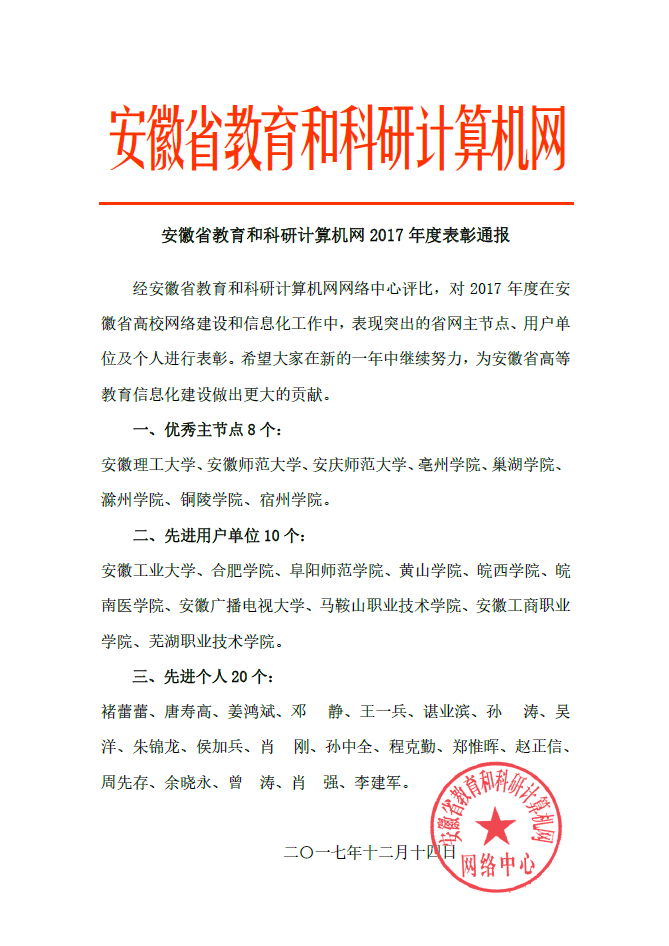 近日,从安徽省教育和科研计算机网2017年学术年会上获悉,我校获2017年度“先进用户单位”荣誉称号,唐寿高老师获“先进个人”荣誉称号。