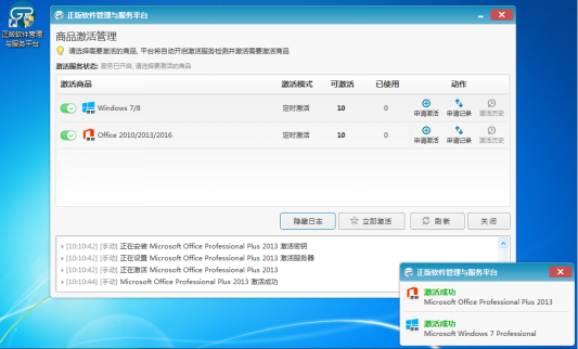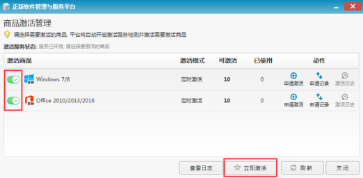 5. 客户端登录后,软件自动弹出商品激活管理窗口(Windows和Office默认各分配10次激活次数),点击左边的选项按钮,勾选需要激活的产品,然后点击【立即激活】。