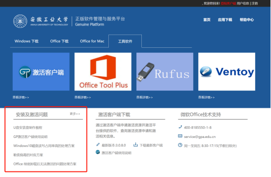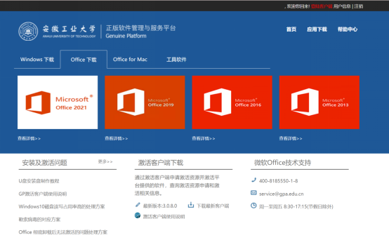 全校师生可通过登录【智慧校园门户】(https://smart.ahut.edu.cn/)访问【办事大厅】,在【IT服务栏目】下点击【正版软件管理与服务平台】,按需下载微软WINDOWS操作系统和OFFICE办公软件,根据附件步骤安装并激活。