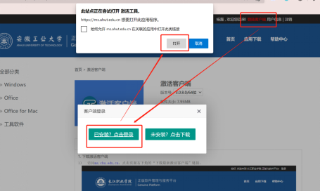 或者回到平台首页,点击右上角【登录客户端】→【已安装?点击登录】,此后,可能会提示“此站点正在尝试打开激活工具” 的弹窗,请选择【打开】。