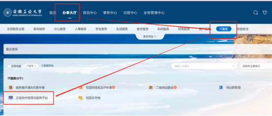 1. 在浏览器上访问【智慧校园门户】(https://smart.ahut.edu.cn/)并完成登录,依次选择【办事大厅】→【IT服务】→【正版软件管理与服务平台】;