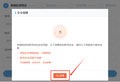 1.新用户的初始密码为弱密码,为确保账号安全及方便重置密码,必须完善个人密保信息和修改初始密码。首次登录时会弹出“安全提醒”页面,点击【马上处理】。