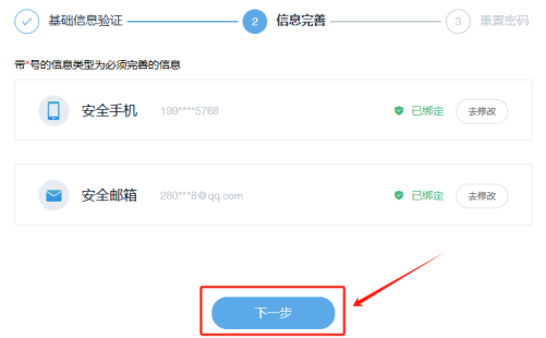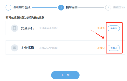 3.自行绑定安全手机和安全邮箱,完善个人密保信息后点击【下一步】。