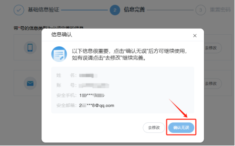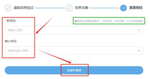 4.个人信息确认无误后,根据密码规则(密码必须包含数字、小写字母、大写字母,且长度满足12~20位)重置密码后点击【完成并登录】。
