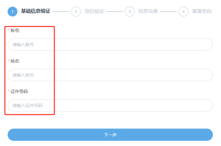 2.如实填写账号、姓名、证件号码等个人信息,完成基础信息验证后点击【下一步】。