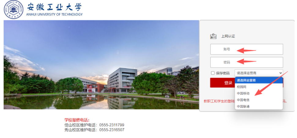 (1)学生登录认证:登录账号为学号,登录密码为各位同学统一身份认证(智慧校园)的密码,登录时需要选择校园网或运营商(中国移动、中国电信、中国联通),选择“校园网”(免费)登录后可访问校内资源。选择三家运营商之一(收费)登录后可访问校内外网络资源。
