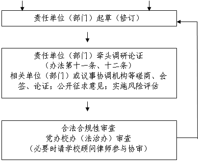 第十七条 建立规范性文件制(修)订合法合规性审查制度。凡属规范性文件,在提请校党委常委会会议或校长办公会议研究决定前,由党办校办(法治办)进行合法合规性审查。