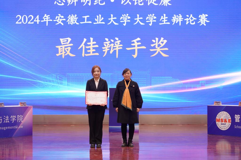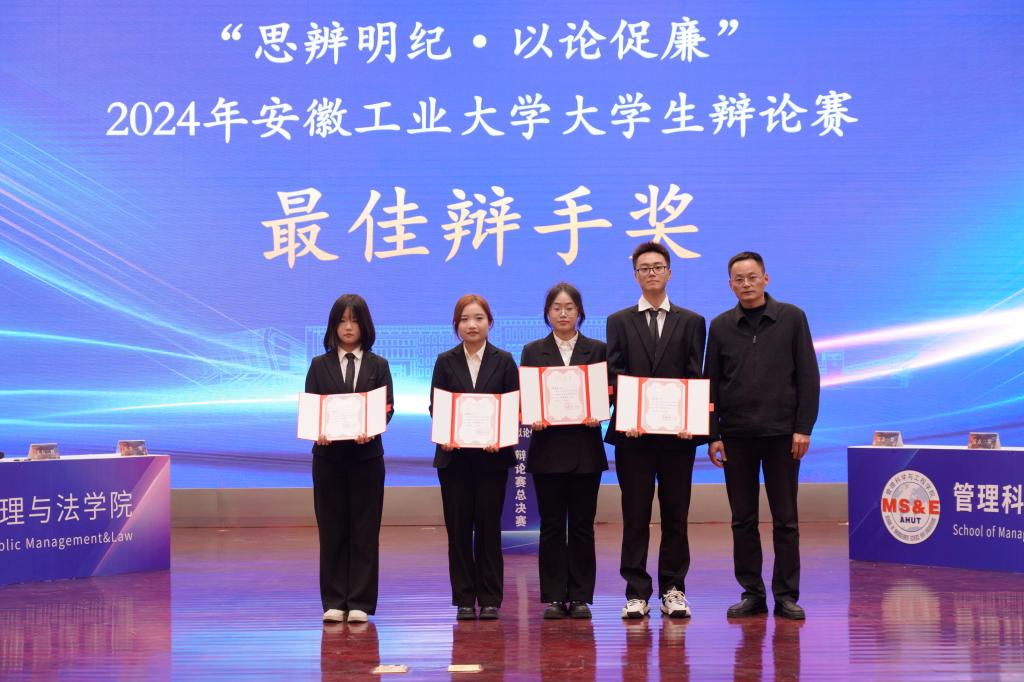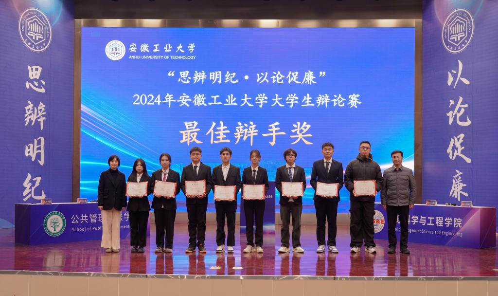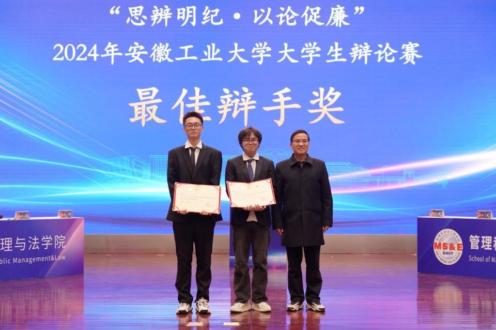 本次大赛对优秀组织奖、冠亚季军代表队和全部赛程中涌现出的最佳辩手进行了颁奖。公共管理与法学院获冠军,管理科学与工程学院获亚军,电气与信息工程学院、能源与环境学院代表队获季军。公共管理与法学院、管理科学与工程学院、电气与信息工程学院、能源与环境学院、外国语学院、马克思主义学院、机械工程学院获“优秀组织奖”。电气与信息工程学院郝钰涵等12名同学获“最佳辩手奖”。
