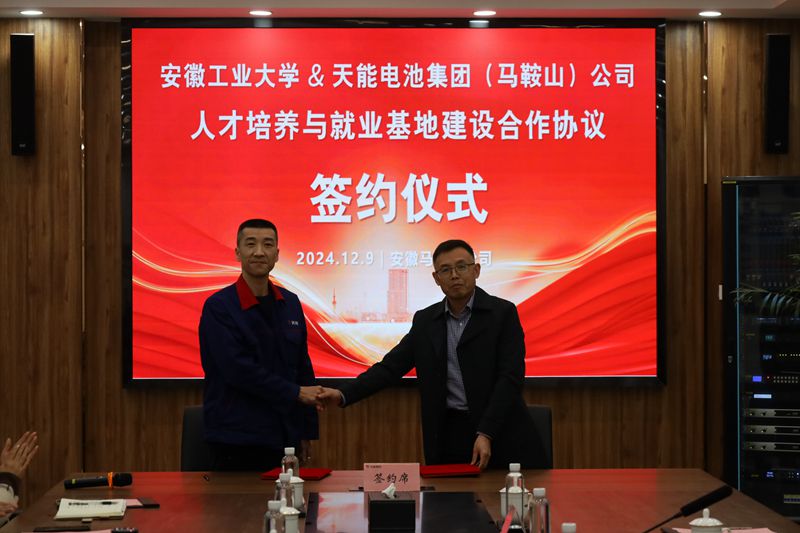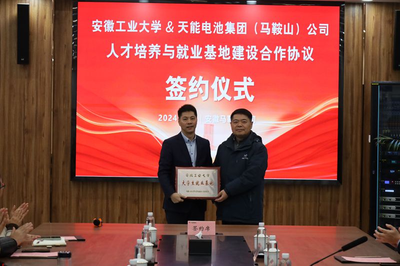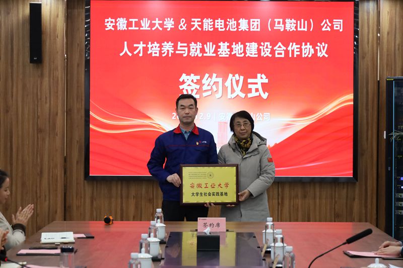 陆林、顾明言向天能电池集团(马鞍山)新能源科技有限公司授予“大学生就业实习基地”“大学生社会实践基地”牌匾。材料科学与工程学院与公司签订人才培养与就业基地建设合作协议。(撰稿:胡卫东 审核:杨建 李波 张苒 黄敏)