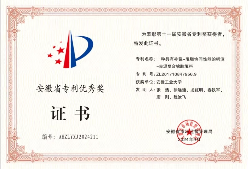 近日,安徽省市场监督管理局公布了《关于第十一届安徽省专利奖授奖的决定》,我校龙红明教授团队申报的“一种具有补强-阻燃协同性能的钢渣-赤泥复合橡胶填料”专利成果获安徽省专利优秀奖。本届安徽省专利奖仅2所安徽高校入选。