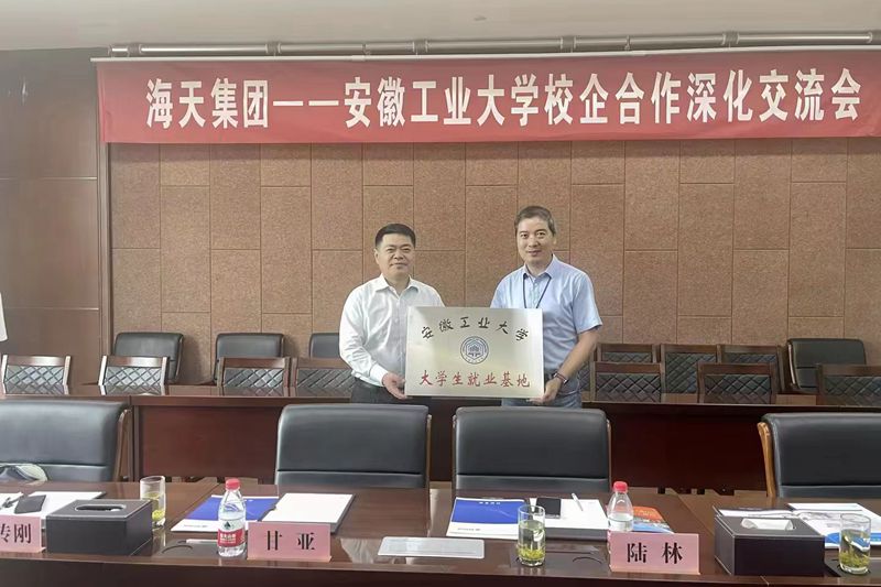 在海天集团,陆林一行参观了企业的数字展示中心,见证了海天就业激励基金签约仪式。陆林向公司授予了“大学生就业基地”牌匾,代表学校对海天集团捐资助学,参与协同育人表示感谢。他表示,学校一定利用好捐赠资金的最大价值,充分发挥特色优势,努力培养更多优秀人才,积极参与、助力海天集团发展。