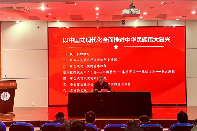 祖明以“以中国式现代化全面推进中华民族伟大复兴”为题,围绕现代化的概念、中国人民追求现代化的历史渊源、中国式现代化的基本框架、中国式现代化的中国特色、全面建成社会主义现代化强国的重大部署、我校的实践等六个方面对党的二十大精神作了系统宣讲阐释。祖明指出,中国式现代化是中国共产党领导的社会主义现代化,既有各国现代化的共同特征,更有基于自己国情的中国特色。以中国式现代化全面推进中华民族伟大复兴,这一论断是路径和目标的合二为一,中国式现代化既是路径同时也是目标。中国式现代化实现之日就是中华民族复兴完成之时。从现在起,中国共产党的中心任务就是团结带领全国各族人民全面建成社会主义现代化强国、实现第二个百年奋斗目标,以中国式现代化全面推进中华民族伟大复兴。中国式现代化是人口规模巨大的现代化、是全体人民共同富裕的现代化、是物质文明和精神文明相协调的现代化、是人与自然和谐共生的现代化、是走和平发展道路的现代化。祖明结合安徽工业大学“十四五”发展规划,阐述了我校在中国式现代化方面的具体实践,建设好、发展好安徽工业大学,就是对全面建成社会主义现代化强国、实现第二个百年奋斗目标,以中国式现代化全面推进中华民族伟大复兴作出的一份贡献。