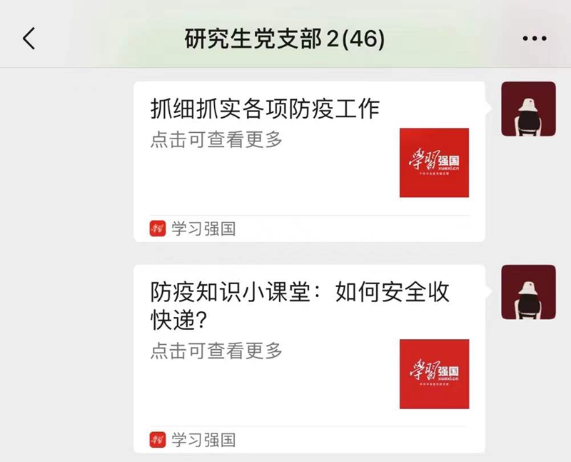 理论学习不打烊。研究生党支部将每周三定为党支部时政分享日,打造学习交流平台,鼓励党员学生积极分享理论热点、学习心得。利用“学习强国”等平台,积极组织开展习近平总书记关于疫情防控的重要讲话指示精神、抗击疫情英雄事迹等专题学习。支部成员在QQ群、微信群积极分享防疫知识宣传、战疫视频等文件资料,结合自己的所思所感展开交流,表示自觉遵守学校疫情防控规定、按时保质推进科研,不因疫情耽误学习进度。