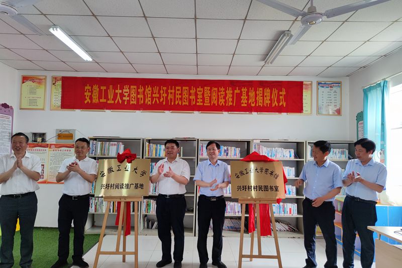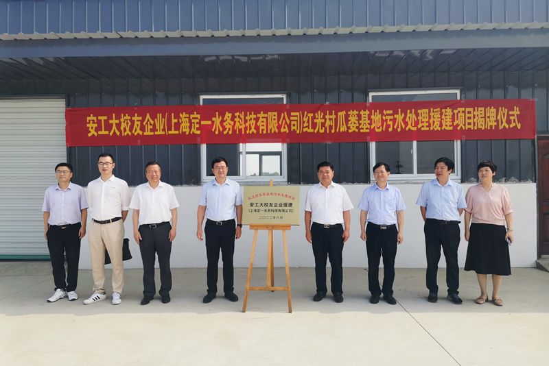 调研期间,校友企业上海定一水务科技有限公司向红光村捐赠了瓜蒌基地污水处理设备。陆林、沙德宏共同为安徽工业大学援建红光村瓜蒌基地污水处理项目揭牌。在兴圩村,陆林、魏先文、祖明、刘凌晨、张朝君共同为我校援建的兴圩村阅读推广基地、兴圩村村民图书室揭牌。